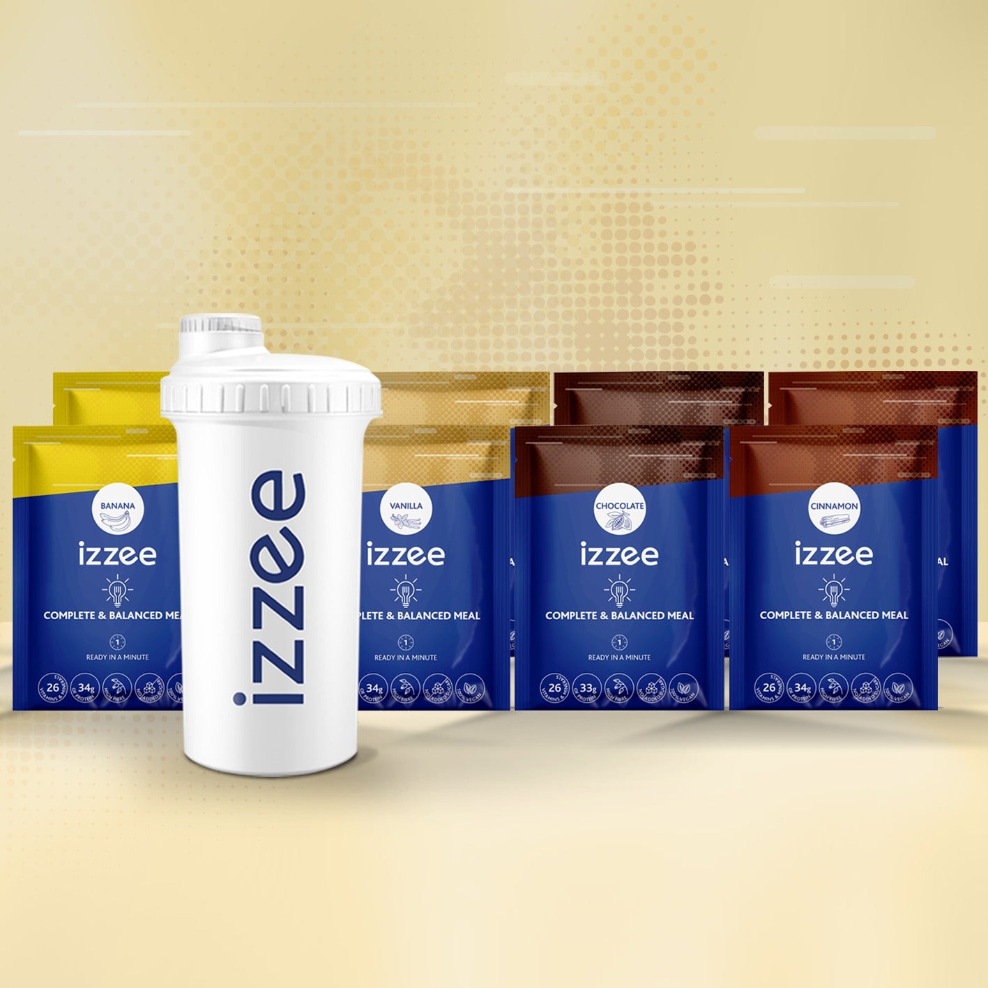 ¡Nuestro nuevo izzee Taster Pack de edición limitada contiene 8 comidas completas y equilibradas en sobres de todos los sabores y un Shaker Gratis! ¡Simplemente mezcla el contenido del sobre con agua y tendrás una comida saludable que te brindará todo lo que tu cuerpo necesita!